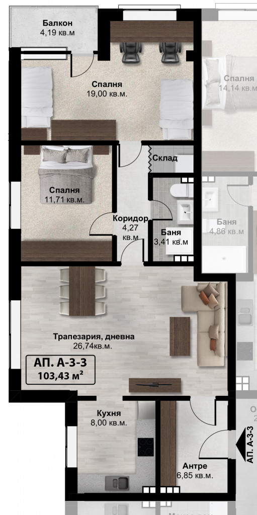 Тристаен Апартамент А-3-3