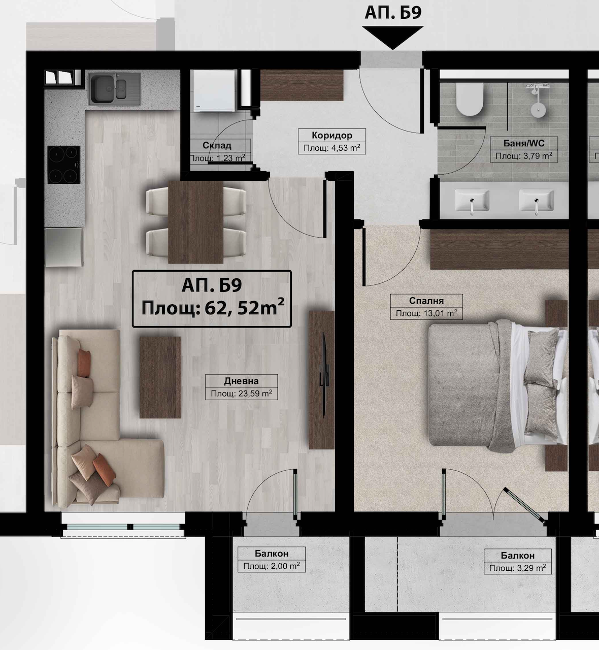 Начало / Сграда Б – Етаж 2 / Апартамент Б-3-3