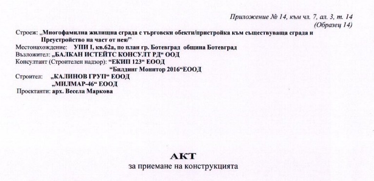 Сградата получи удостоверение по чл. 181 от ЗУТ – документ, който позволява отделните обекти да бъдат предмет на сделки още преди окончателното въвеждане в експлоатация. След Акт 14 бяха завършени основните конструкции, зидарии